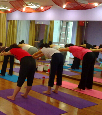 ②吸气,弯曲左膝,是上身往下压,注意保持右脚绷直。