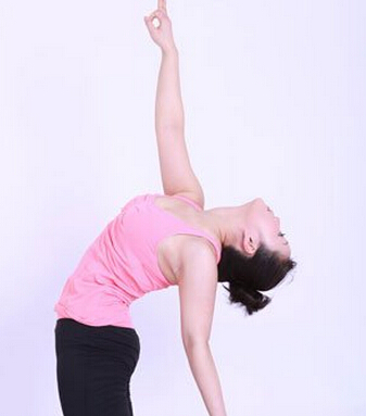 ③吸气,身体向后弯。尽量向后弯,将全身肌肉拉紧。